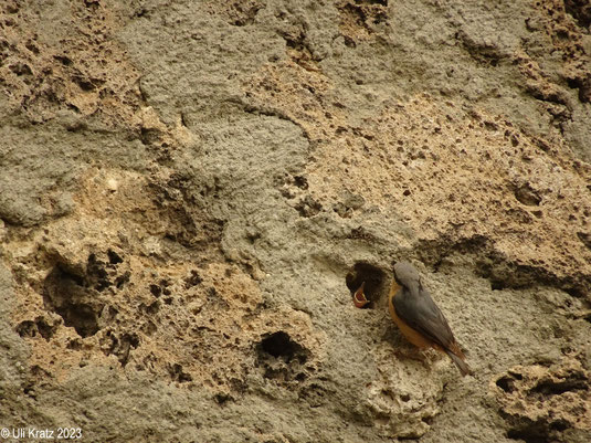 ein Kleiber beim füttern seiner Jungen im Nest, das er in der